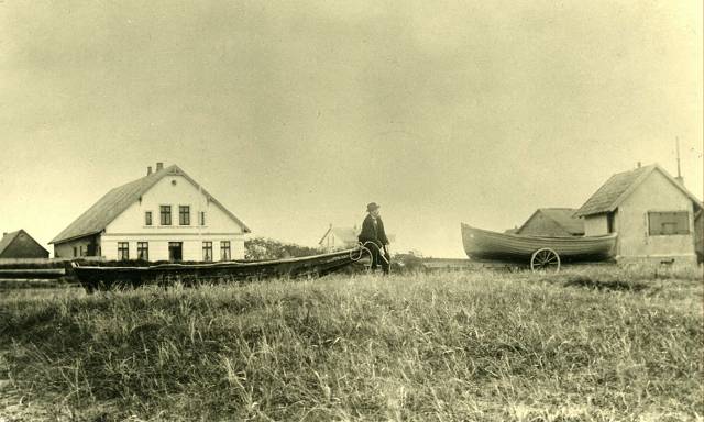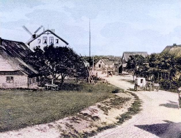 ca. 1900: Gasthof zur Post und dahinter das heutige Hotel am Meer. Im Vordergrund fahren gerade die Wattwagen los. Der unbekannte Fotograf stand ungefähr da, wo heute das Duhner Buernhus steht.