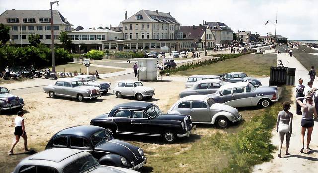 vermutl. Anfang 1950er: Parken direkt am Deich, auch damals schon nicht kostenlos. Der Fotograf stand in Höhe des damaligen Ove-Ovens-Hauses (heute: Standort Haus Panorama) und blickt entlang des Deiches in Richtung Strandhotel Kamp und der Lesehalle ganz hinten.