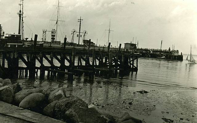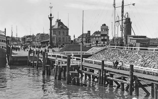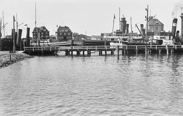 Ende 1920er: Blick von der heutigen Wulf-Schlepperpier auf den heutigen Passagierschiff-Anleger im Alten Hafen. Im Hintergrund ist das Gebäde des Deutschen Wetterdienstes zu sehen, welches ca. 1925 erbaut wurde, und an der Pier liegt u.a. das Feuerschiff Elbe 4.