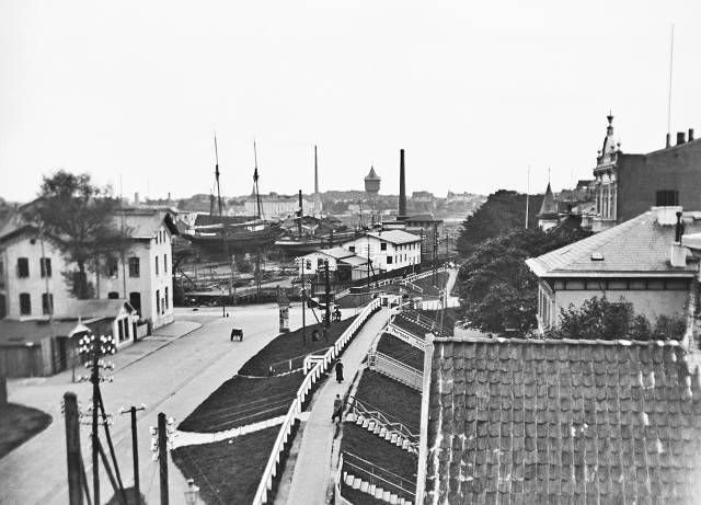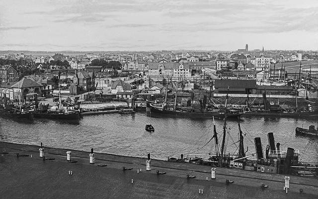 1926: Blick vom ehemaligen Hafenbahnhof auf den alten Hafen. Der Hafenbahnhof war dort, wo heute das Gebäde der Wulf-Reederei steht. Im Hintergrund ist unter anderem Zeitball und das Semaphor zu sehen.