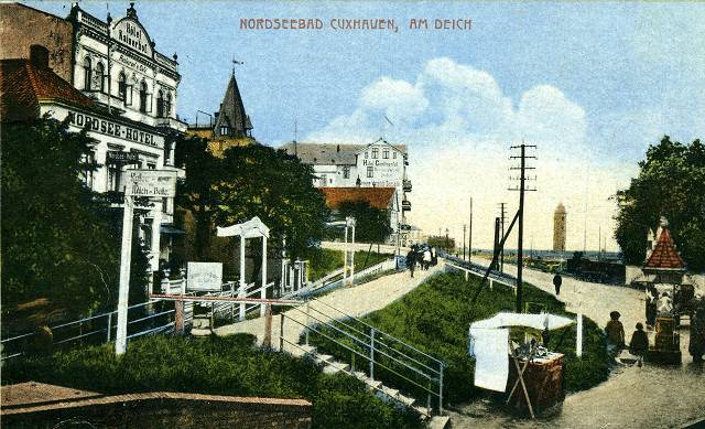 ca. 1922: Blick vom Hotel Continental entlang der Deichlinie auf die Mützelfeldwerft. Links im Bild ist an der Kreuzung das Gebäde des Zolls zu sehen.