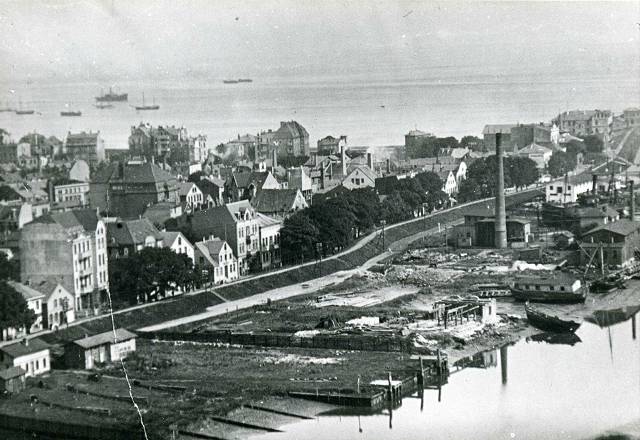 1920: Blick entlang der Deichlinie von der Kreuzung Deichstraße/Zollkaje aufgenommen. Vorne ist ein Teil des Deichdurchlasses erkennbar, der erst 2025 abgerissen wurde.