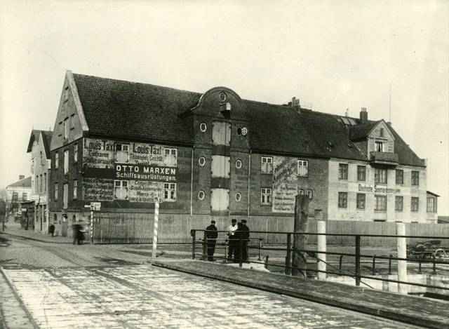 ca. 1920: Blick von der damaligen Drehbrücke (heute Klappbrücke) auf den Speicher, der 1939 abgerissen wurde.