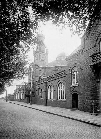 ca. 1925: Die von 1900 bis 1902 erbauten Hapag-Hallen. Bis zur Jahrhundertwende fand die Abfertigung der Hapag-Passagiere in Hamburg statt. Dann wurde diese durch Albert Balin nach Cuxhaven verlegt. Zunächst stiegen die Fahrgäste am alten Hafenbahnhof aus, bis dann die Hapag-Hallen mit dem neuen Hafenbahnhof in Betrieb genommen werden konnten.