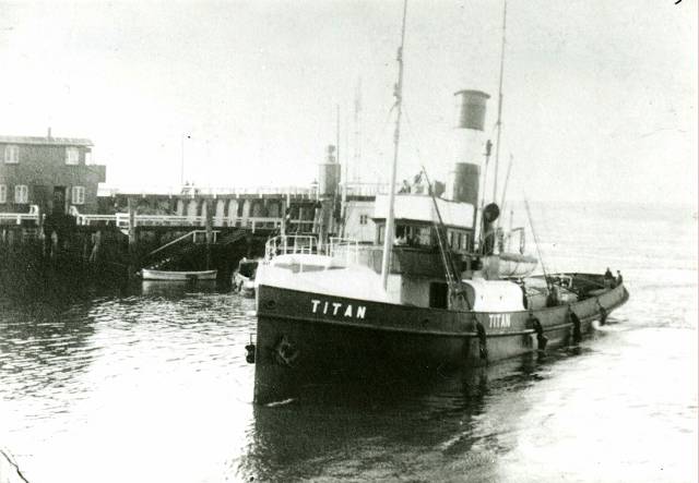 ca. 1929: Der Schlepper Titan fährt in den Alten Hafen. Im Hintergrund sieht man die Alte Liebe.