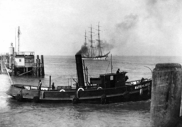 1920er: Der Reededampfer Alte Liebe fährt aus dem Alten Hafen. Im Hintergrund sieht man ein unbekanntes Vollschiff.