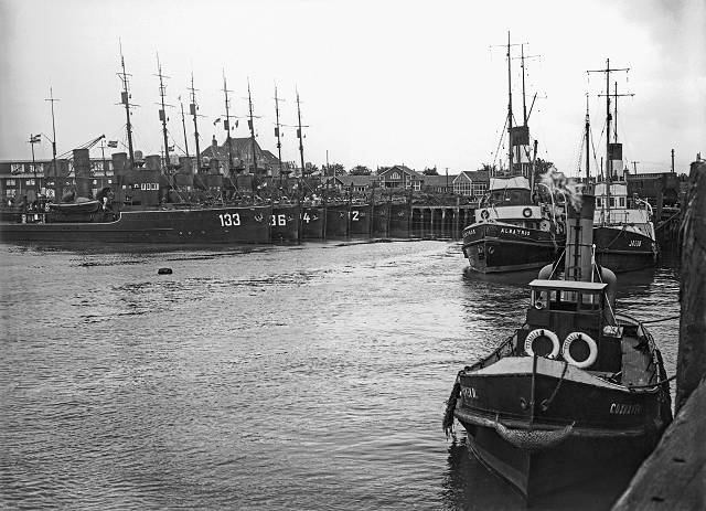 1923 oder früher: Blick aus dem Bereich des Steubenhöfts in den Amerikahafen. Hier war seit dem Beginn des 20. Jahrhunderts die Minensucherflotte für die Nordsee stationiert. Im Bild ist u.a. das Minensuchboot 133 der Reichsmarine zu sehen. Dies war bis Oktober 1923 in der Nordsee stationiert und ab dann in der Ostsee. Daher ist die Datumsangabe des Bildes im Buch des Oceanum-Verlages (um 1926) vermutlich falsch. Rechts im Bild sind die Dampfschlepper Albatros und Jason zu sehen. Die Jason wurde 1913 erbaut und seit Ende der 1910er Jahre als Schlepper eingesetzt. 1959 wurde sie abgewrackt.