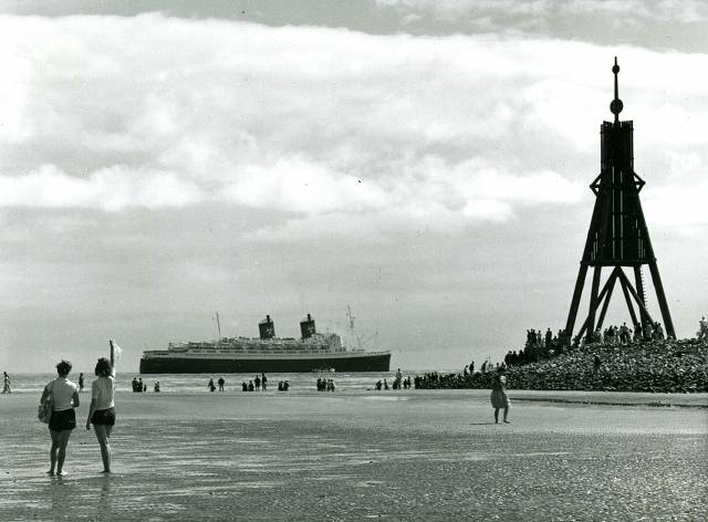 1961: Das Passagierschiff Hanseatic passiert die Kugelbake