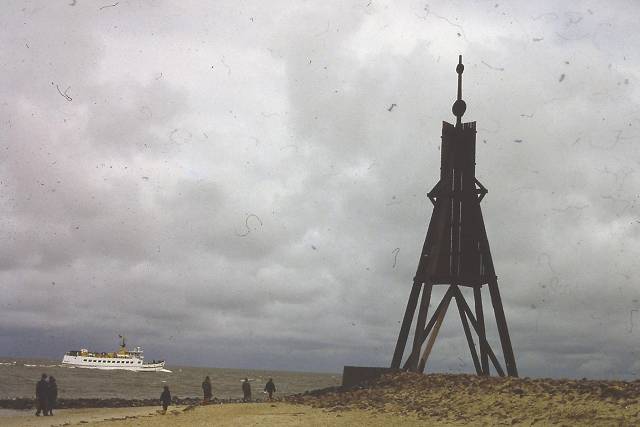 Kugelbake mit dem rückehrendem Neuwerk-Schiff