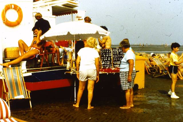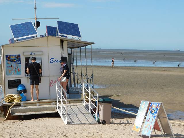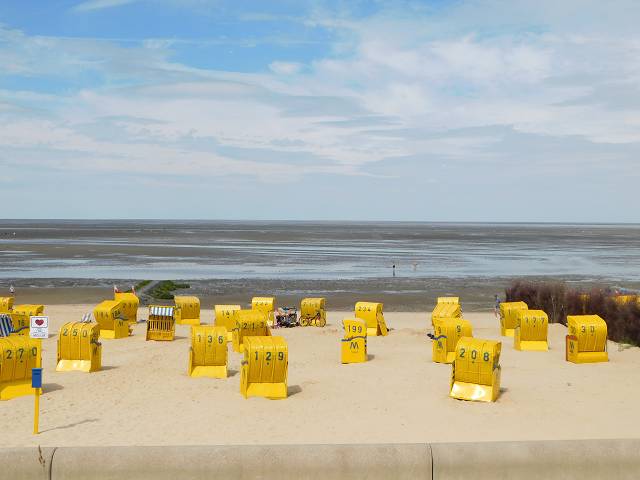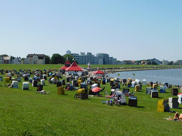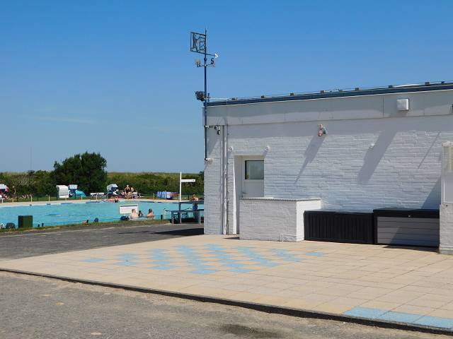 Strandabschnitt zwischen Schwimmbad und Rettungsstation, vom Deich aus gesehen.