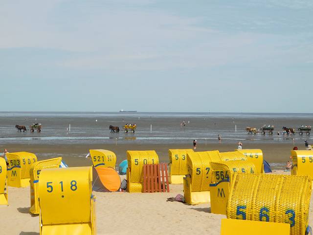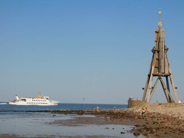 Kugelbake, jeweils mit dem Schiff, das Cuxhaven mit Neuwerk verbindet