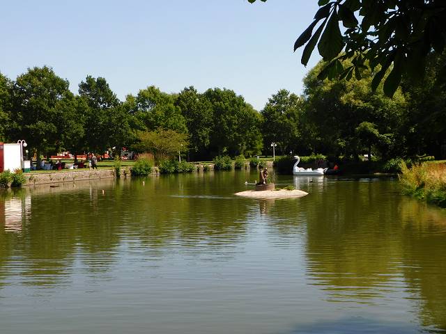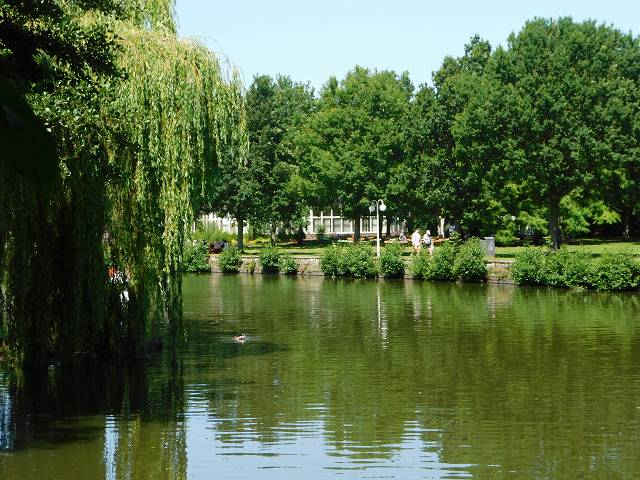 See im Kurpark Döse mit Kugelbakehalle im Hintergrund