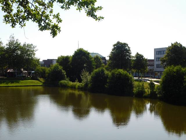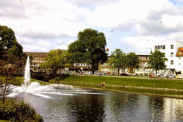 Im Vordergrund der Ritzebütteler Schleusenpriel, im Hintergrund das Gebäude der Cuxhavener Nachrichten