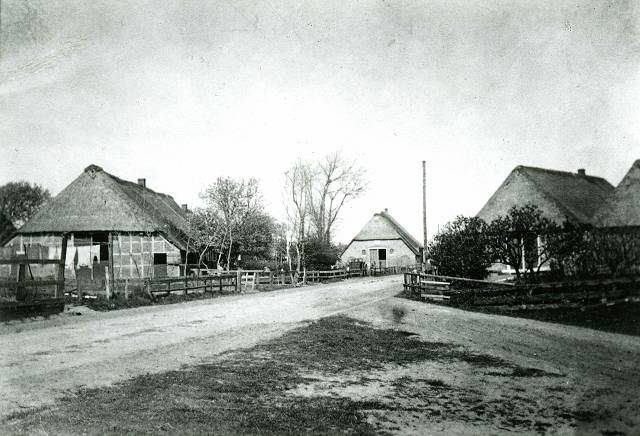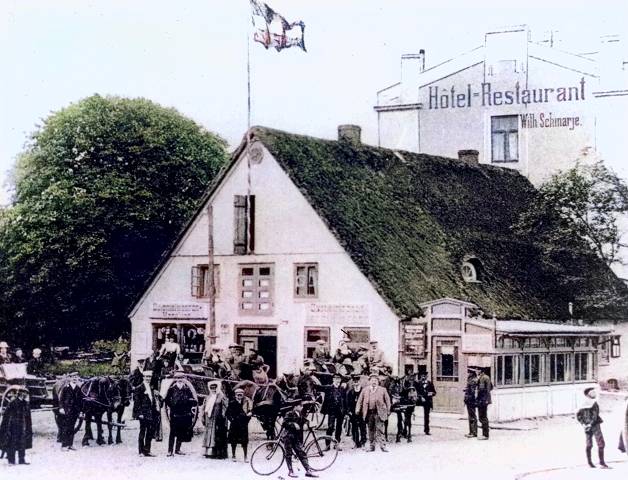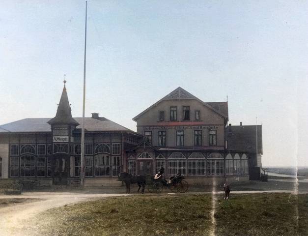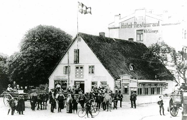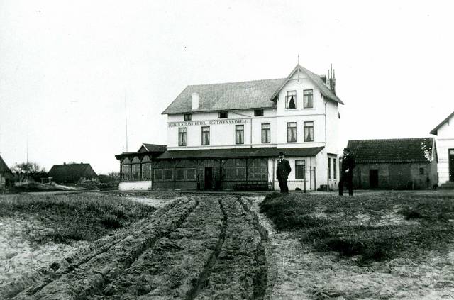 ca. 1900: Gasthof zur Post und dahinter das heutige Hotel am Meer. Im Vordergrund fahren gerade die Wattwagen los. Der unbekannte Fotograf stand ungefähr da, wo heute das Duhner Buernhus steht.