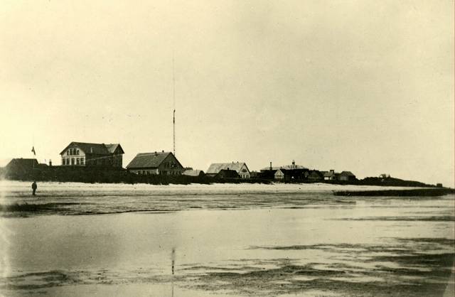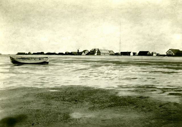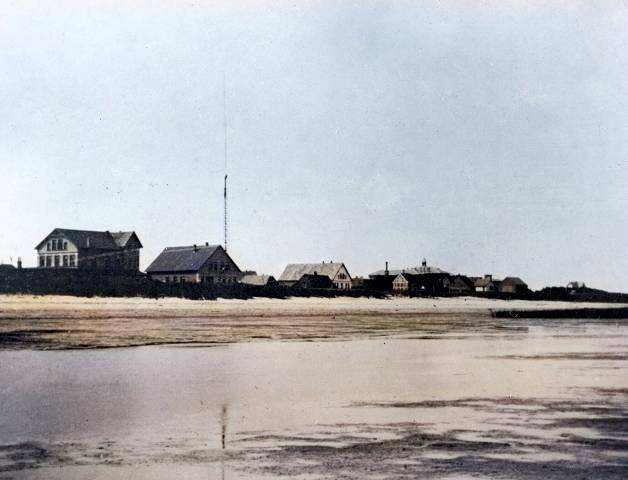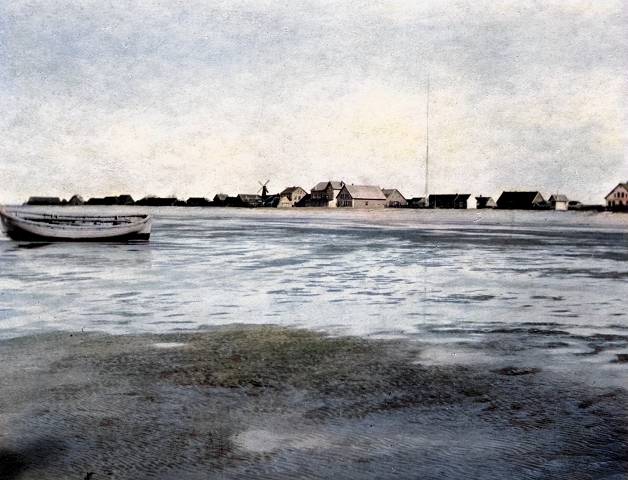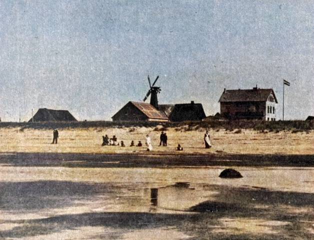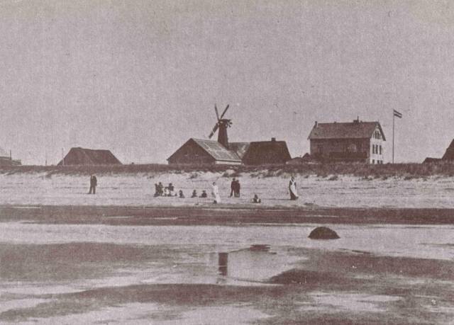ca 1902: Blick vom Watt auf den östlichen Teil des Ortes Duhnen. In der linken Bildhäfte sieht man die Flügel des Duhner Windmotors. Er diente dazu Maschinen auf einem Hof anzutreiben.
