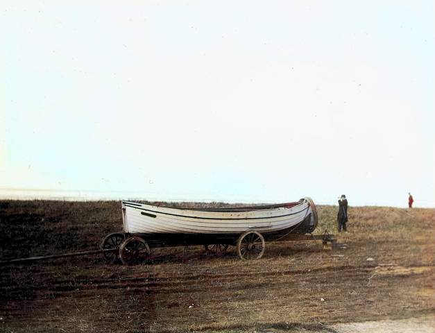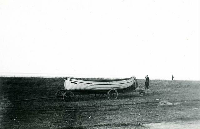 ca 1900: Duhner Rettungsboote auf dem Deich neben dem alten Rettungsschuppen