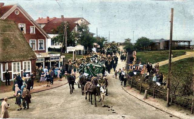 1928: Blick vom Hotel am Meer in die Strandstraße. Anlass war die Beisetzung des Vormanns der Duhner DGzRS-Rettungsstation. Er wird aufgebahrt in "seinem" Boot transportiert. Die Rettungsstation Duhnen wird 1932 nach ca. 90 Jahren, davon knapp 70 Jahre unter der Ägide der DGzRS aufgelöst. Das an der Station Cuxhaven neu angeschaffte Doppelschrauben-Motorretungsboot, seinerzeit das leistungsstärkste der DGzRS konnte die Aufgaben der Duhner Station mitübernehmen.
