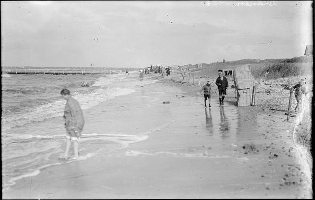 1926: Am Strand. Im Hintergrund ist der Steg zur Badebrücke zu sehen.