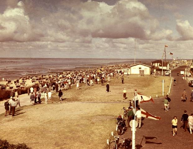 1950er: Blick entlang des Deichs und der Strandstraße in Richtung Lesehalle. Links ist das Hotel Strandperle zu sehen.