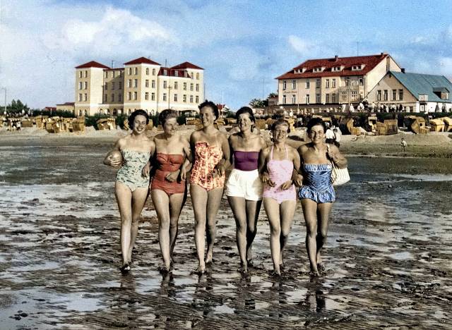 1956: Damen in damals üblicher Badekleidung vor dem Ove-Ovens-Haus und Strandhotel